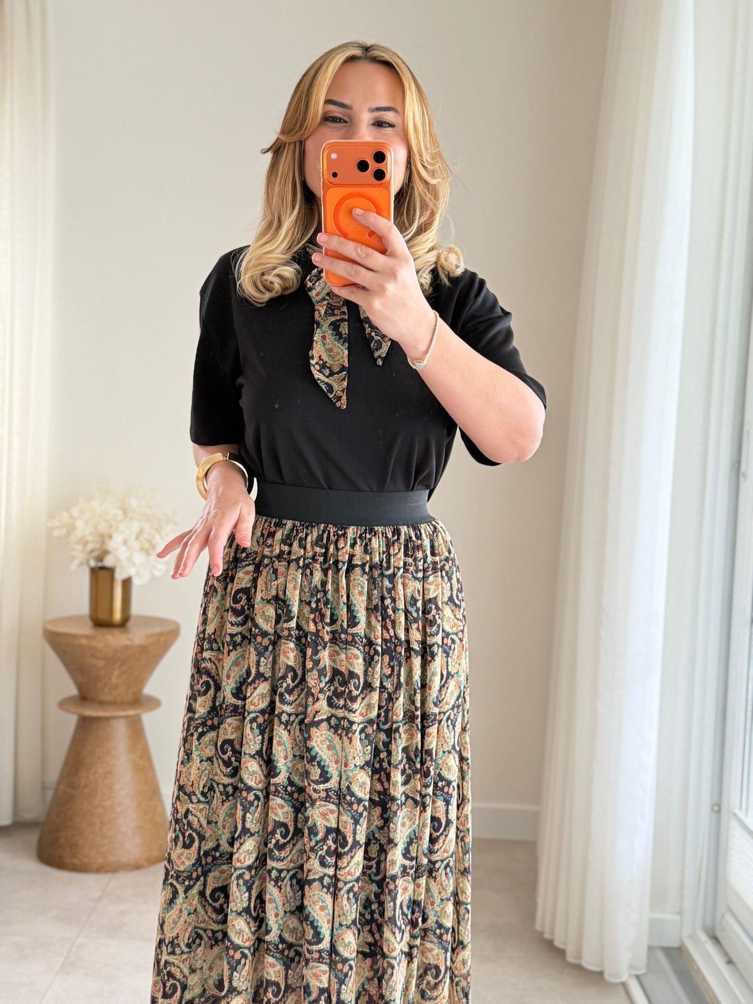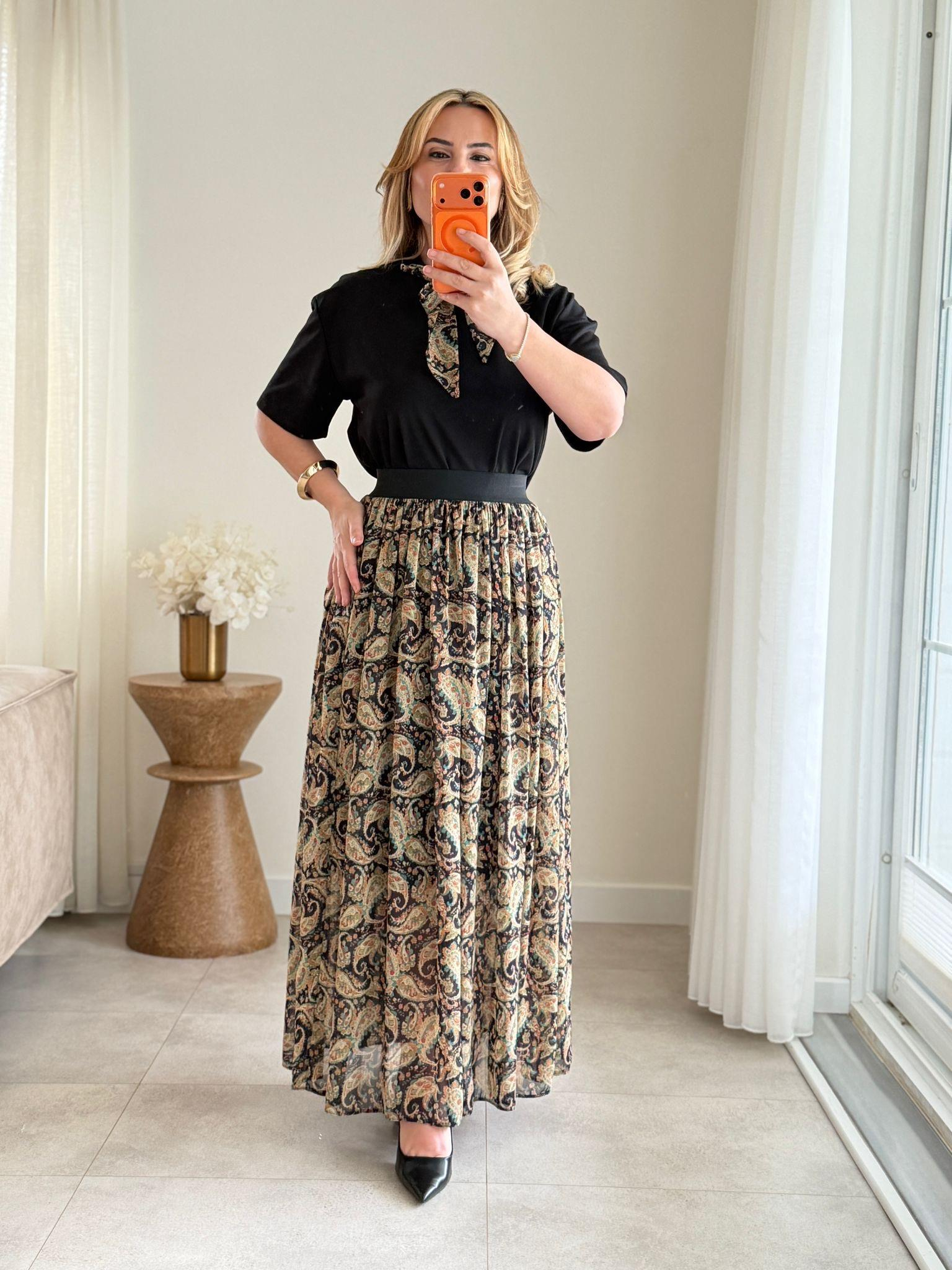 üst kısmı, hafif ve rahat kesimi sayesinde vücuda hoş bir oturuş sağlar; eteği ise şık bir siluet oluşturacak şekilde tasarlanmıştır. Fular detayı, kombine zarif bir dokunuş katar ve stilinizi bir adım öne taşır.