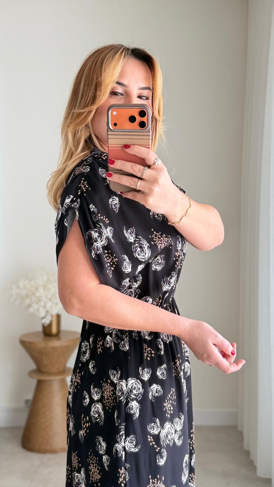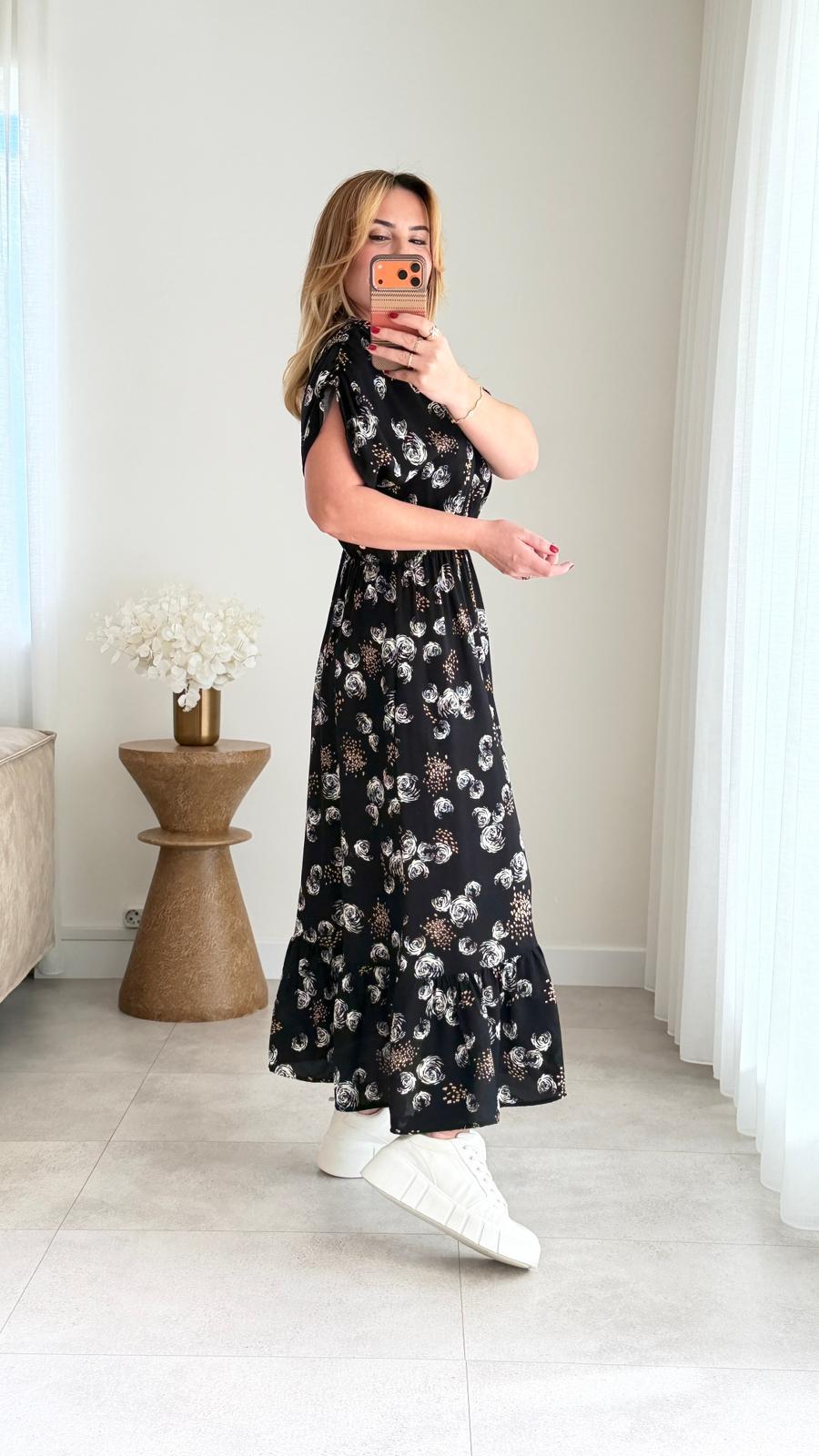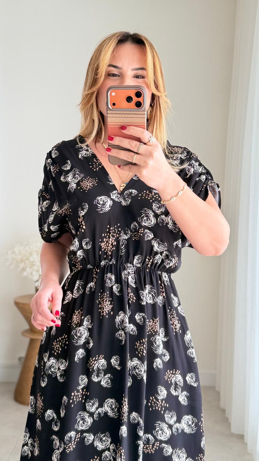 8920 Siyah Gül Desen v Yaka Bel Lastikli Elbise (SK-08920)