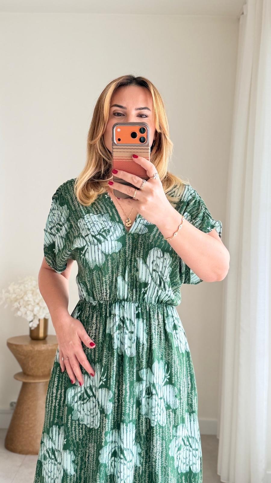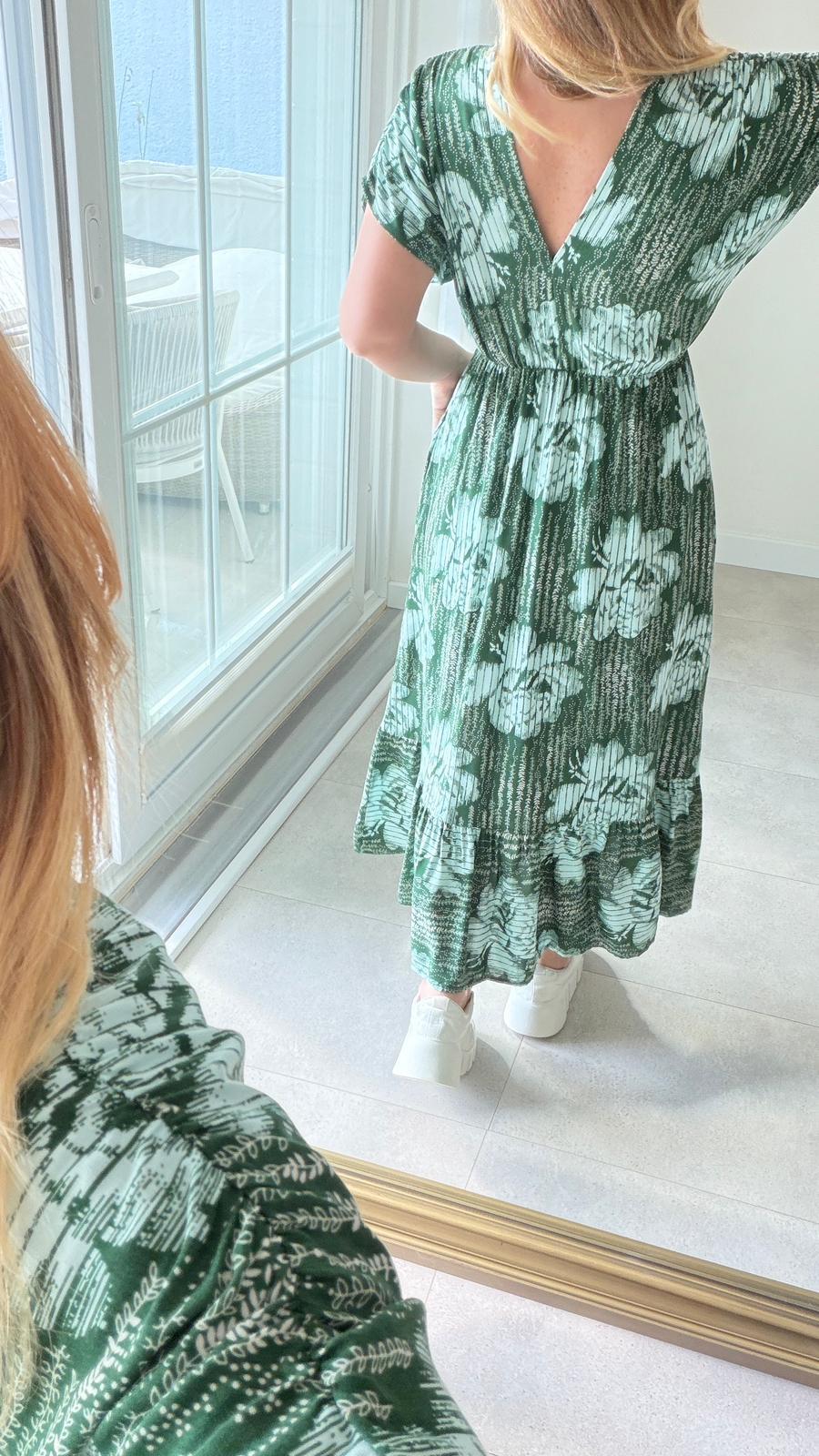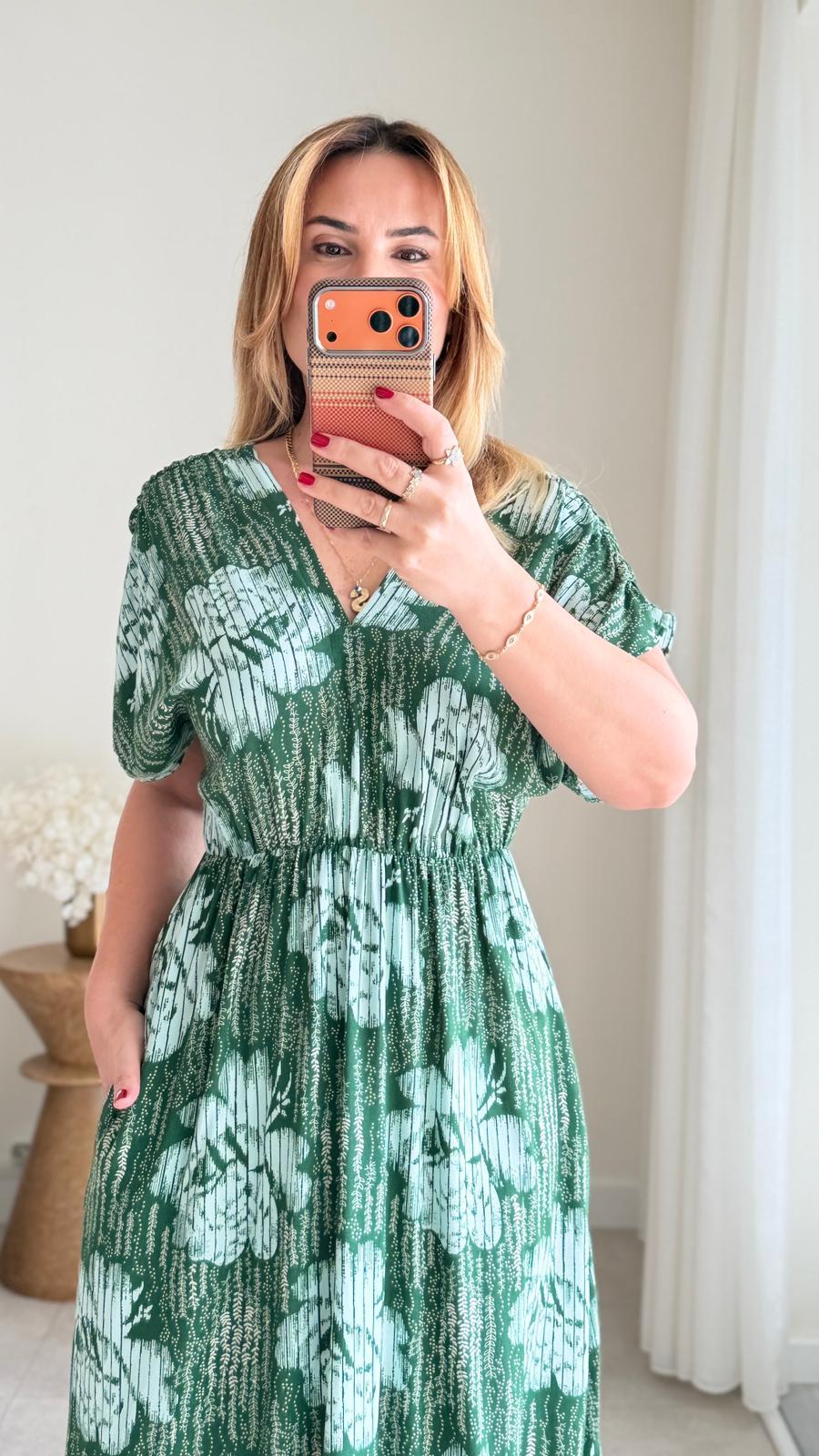 8923 Zümrüt Çiçek Desen v Yaka Bel Lastikli Elbise