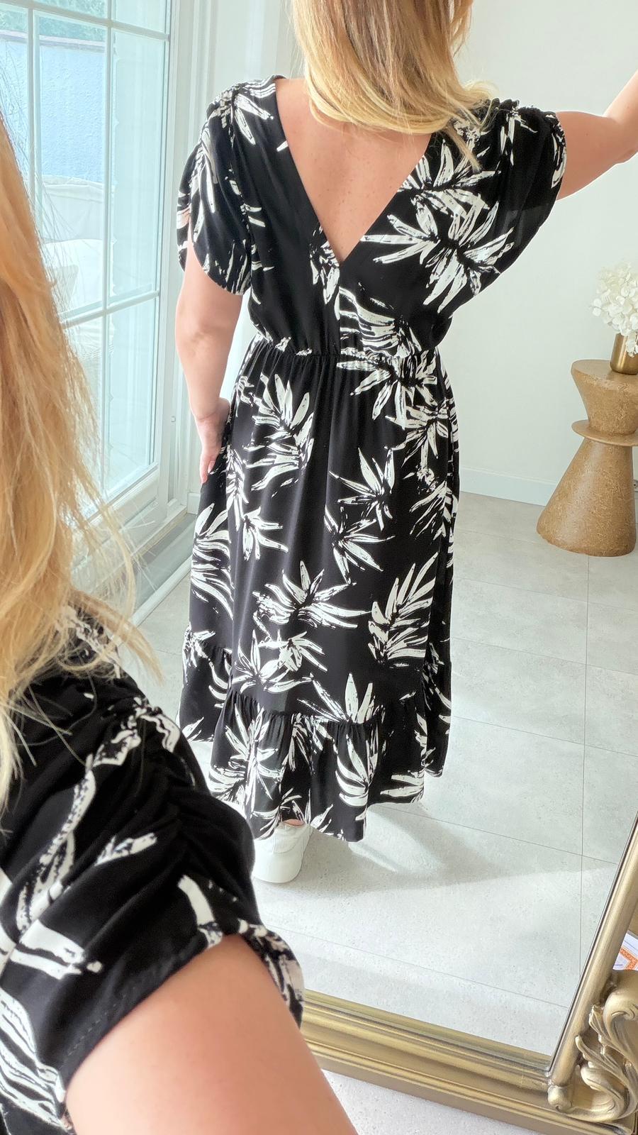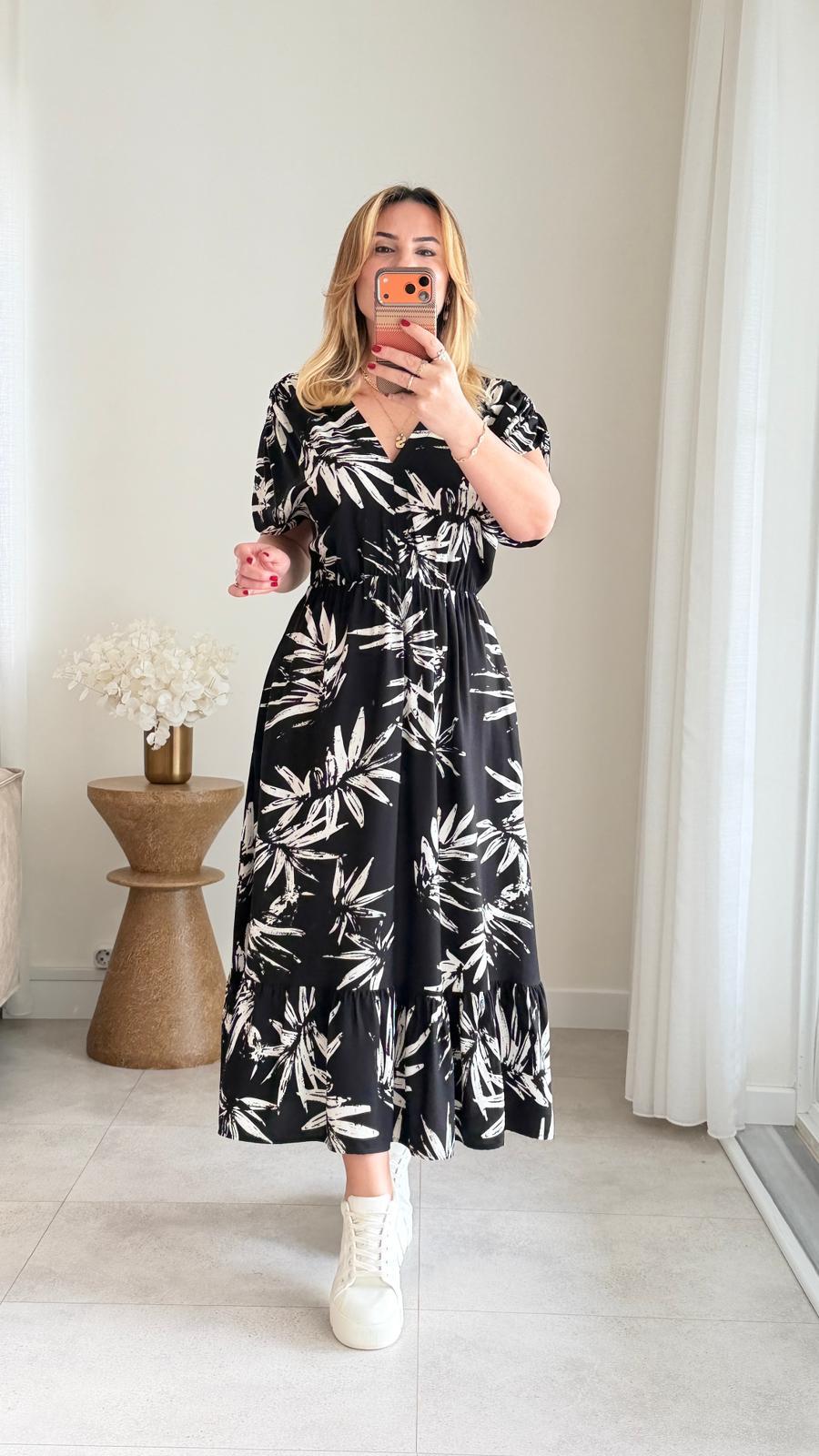 8924 Siyah Yaprak Desen v Yaka Bel Lastikli Elbise
