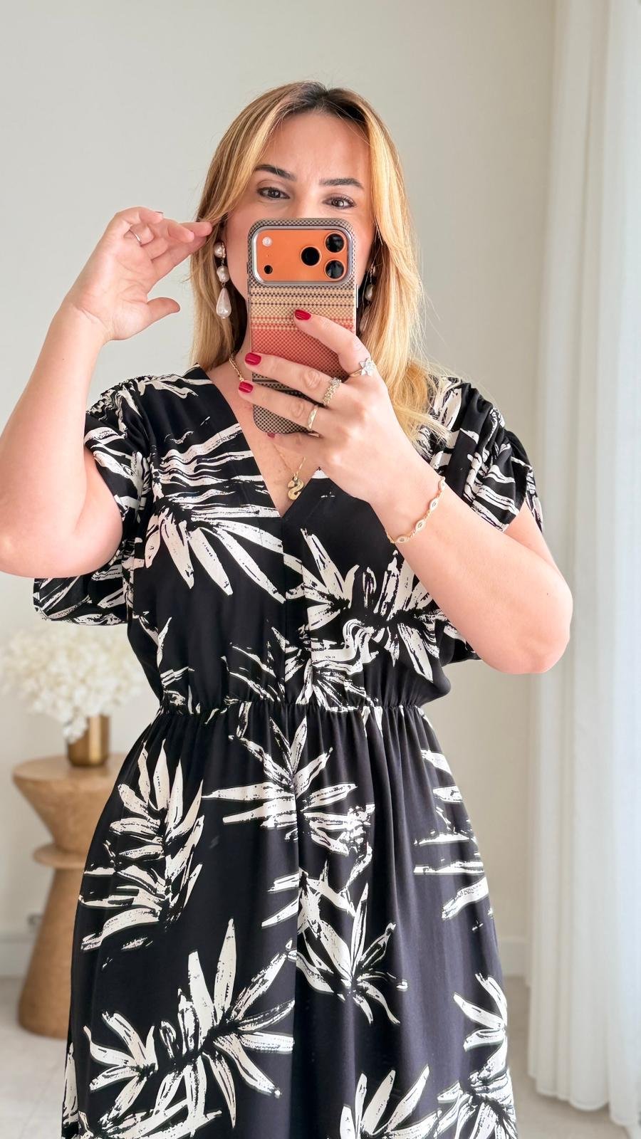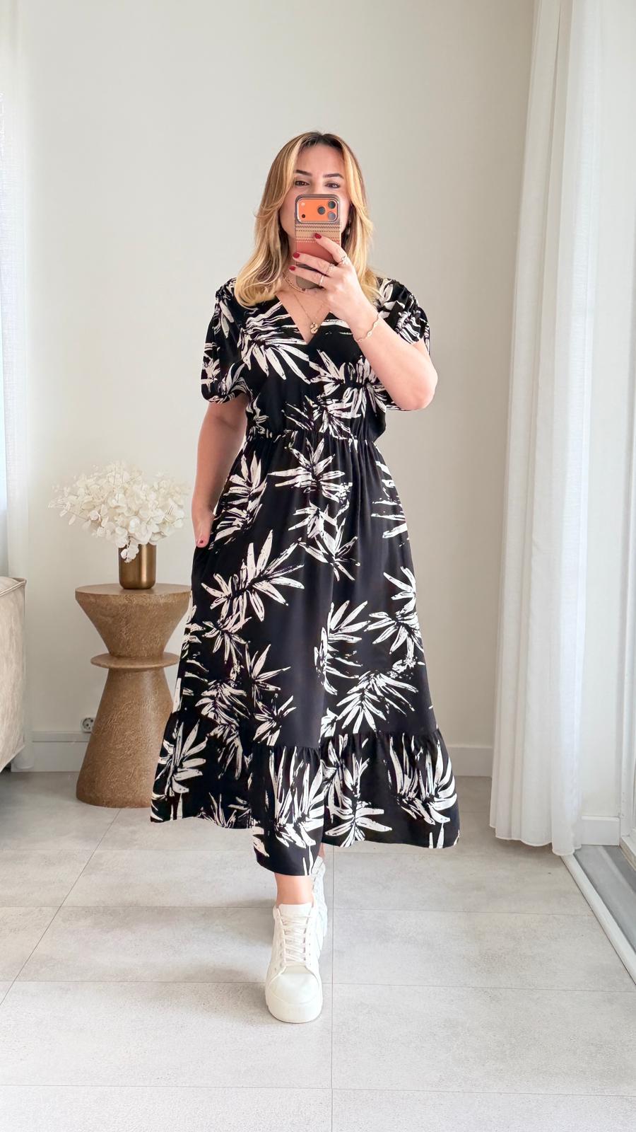 8924 Siyah Yaprak Desen v Yaka Bel Lastikli Elbise (SK-08924)