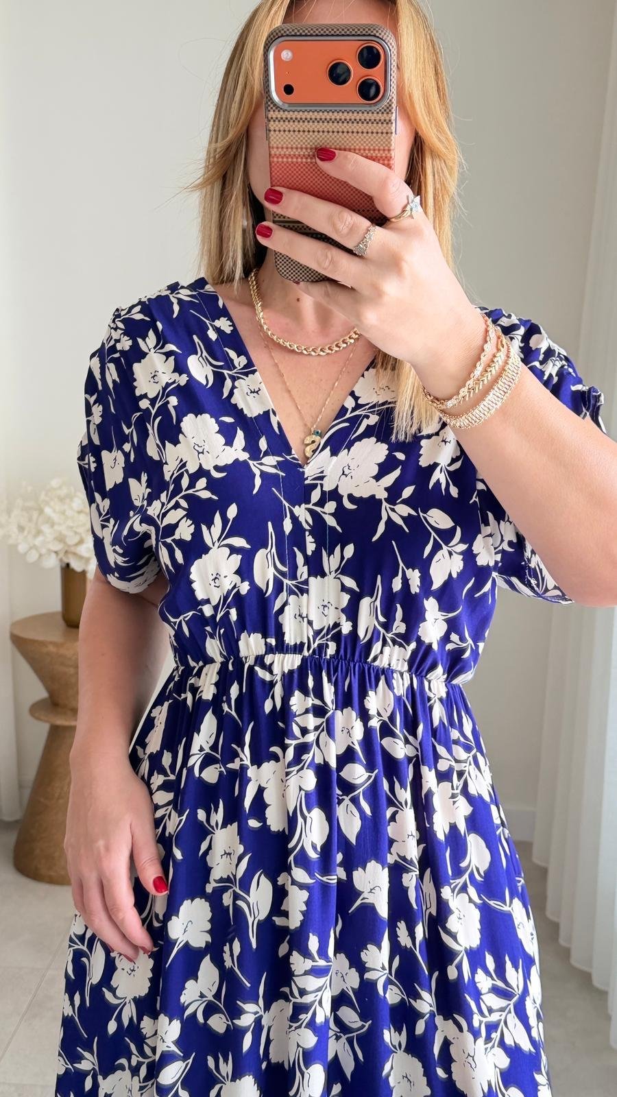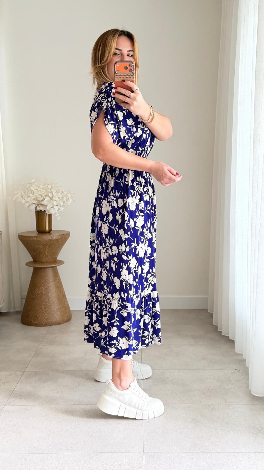 8928 Sax Çiçek Desen v Yaka Bel Lastikli Elbise