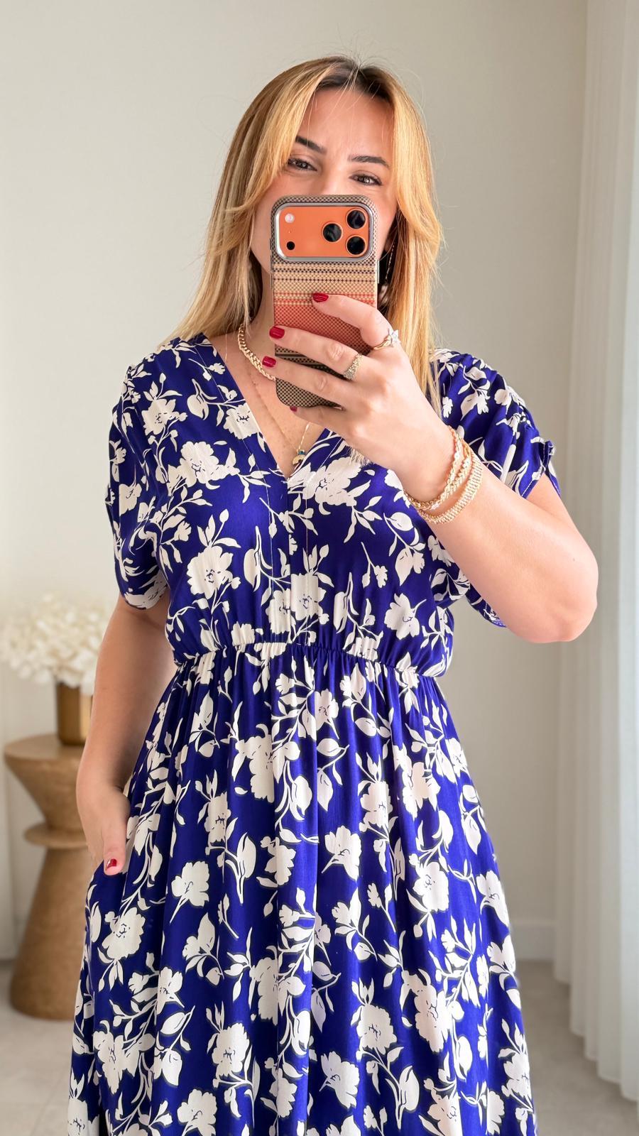 8928 Sax Çiçek Desen v Yaka Bel Lastikli Elbise (SK-08928)