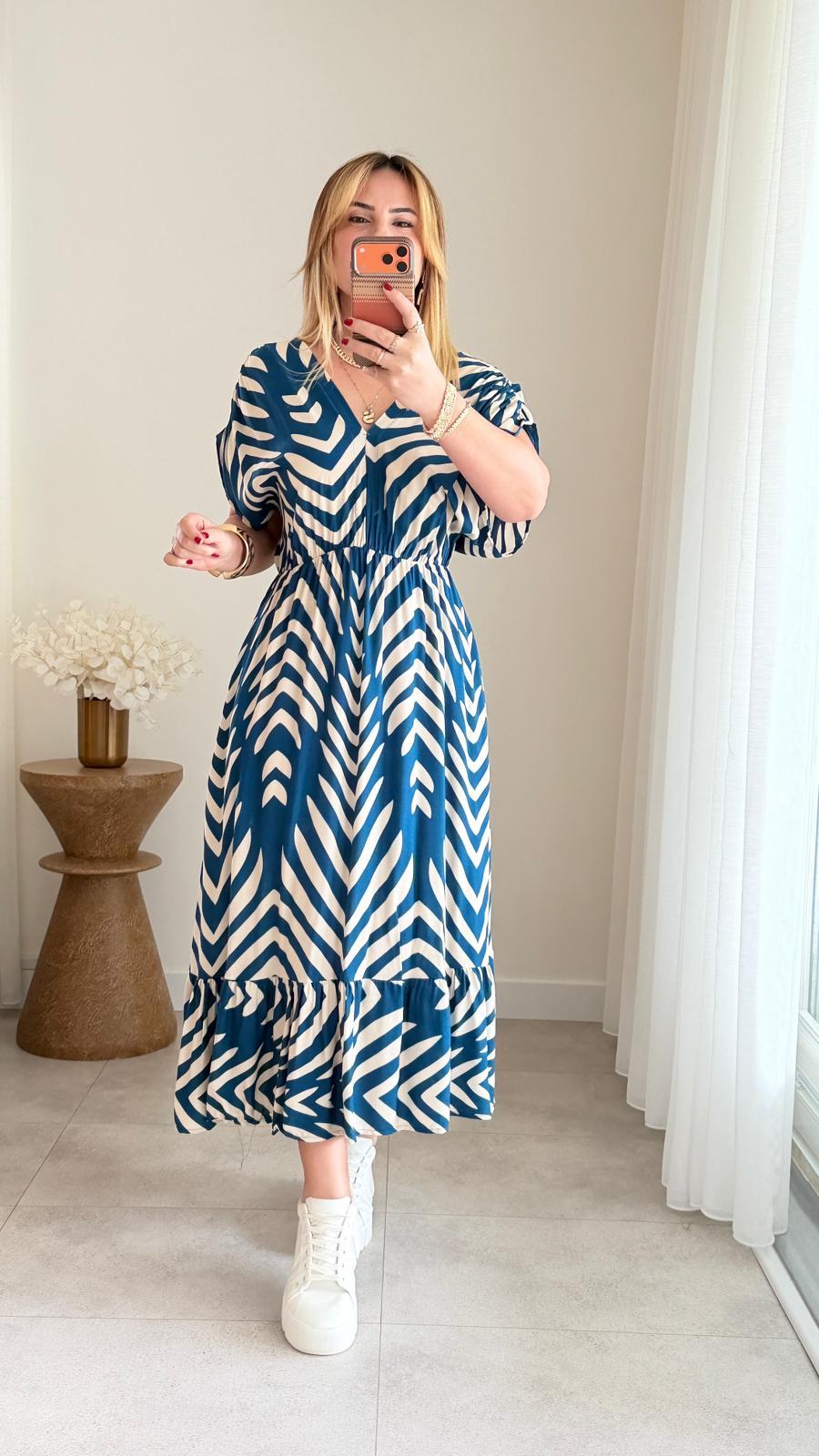 8933 Petrol Krem Desen v Yaka Bel Lastikli Elbise