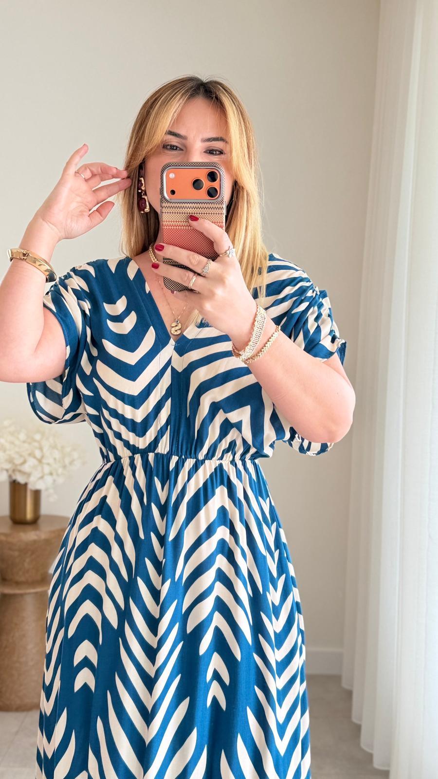8933 Petrol Krem Desen v Yaka Bel Lastikli Elbise (SK-08933)