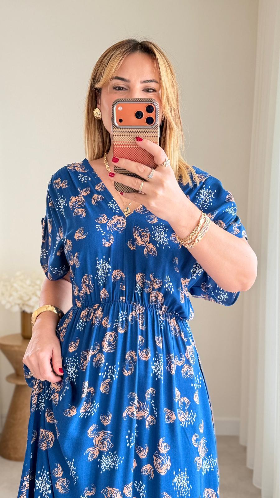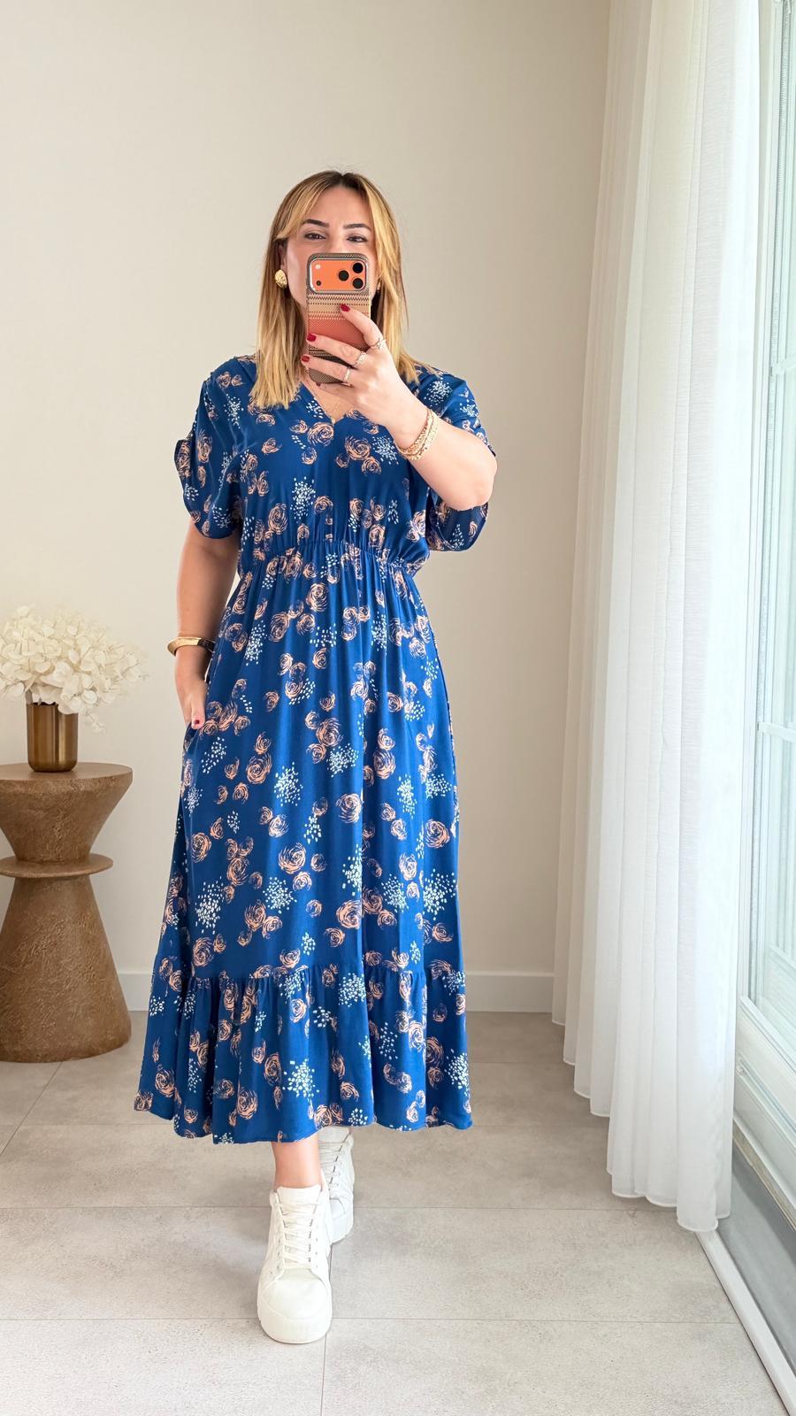 8935 Lacivert Gül Desen v Yaka Bel Lastikli Elbise (SK-08935)