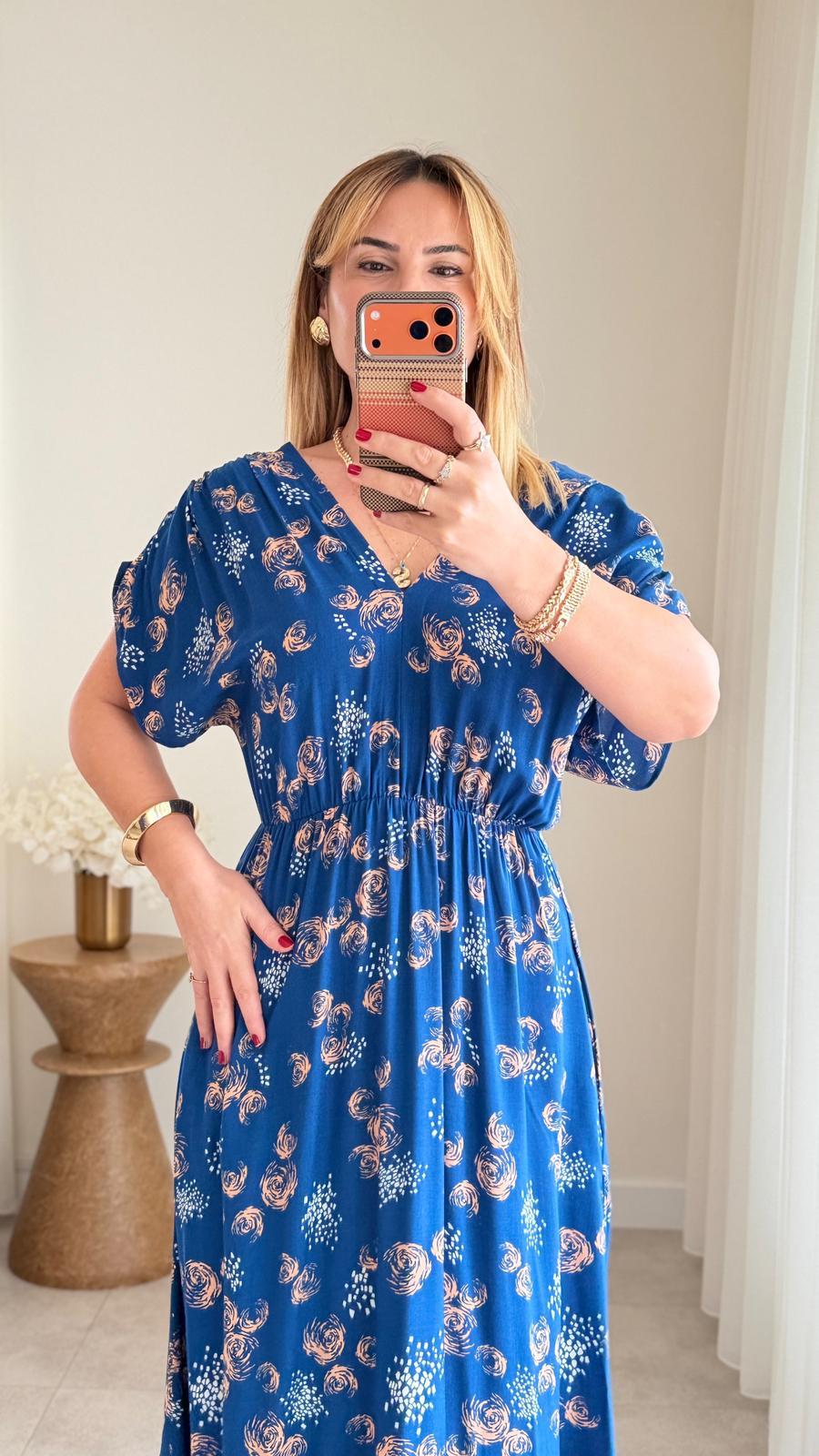 8935 Lacivert Gül Desen v Yaka Bel Lastikli Elbise