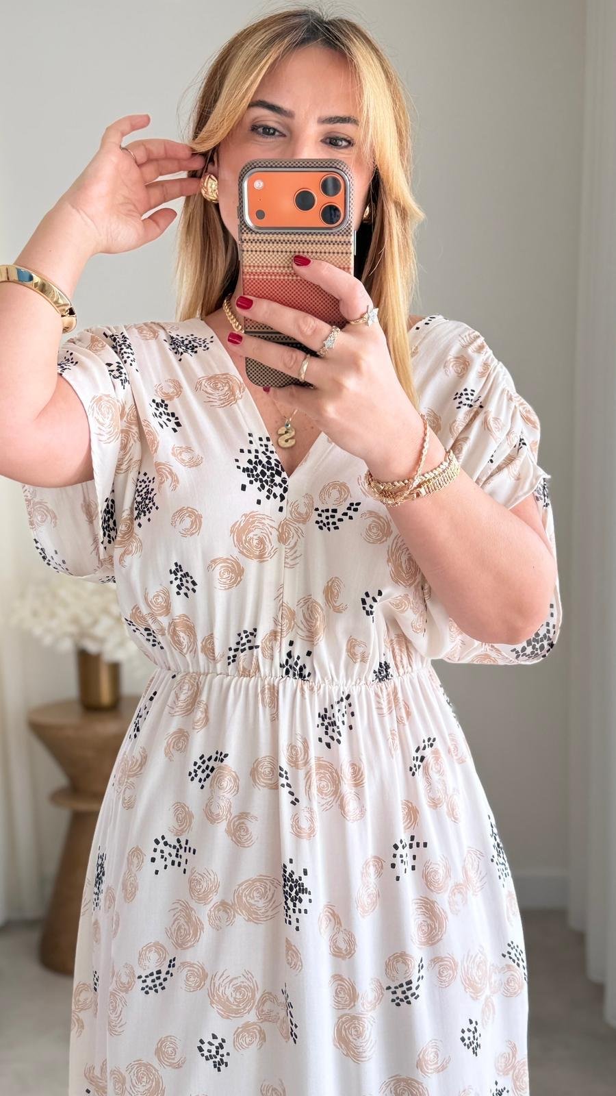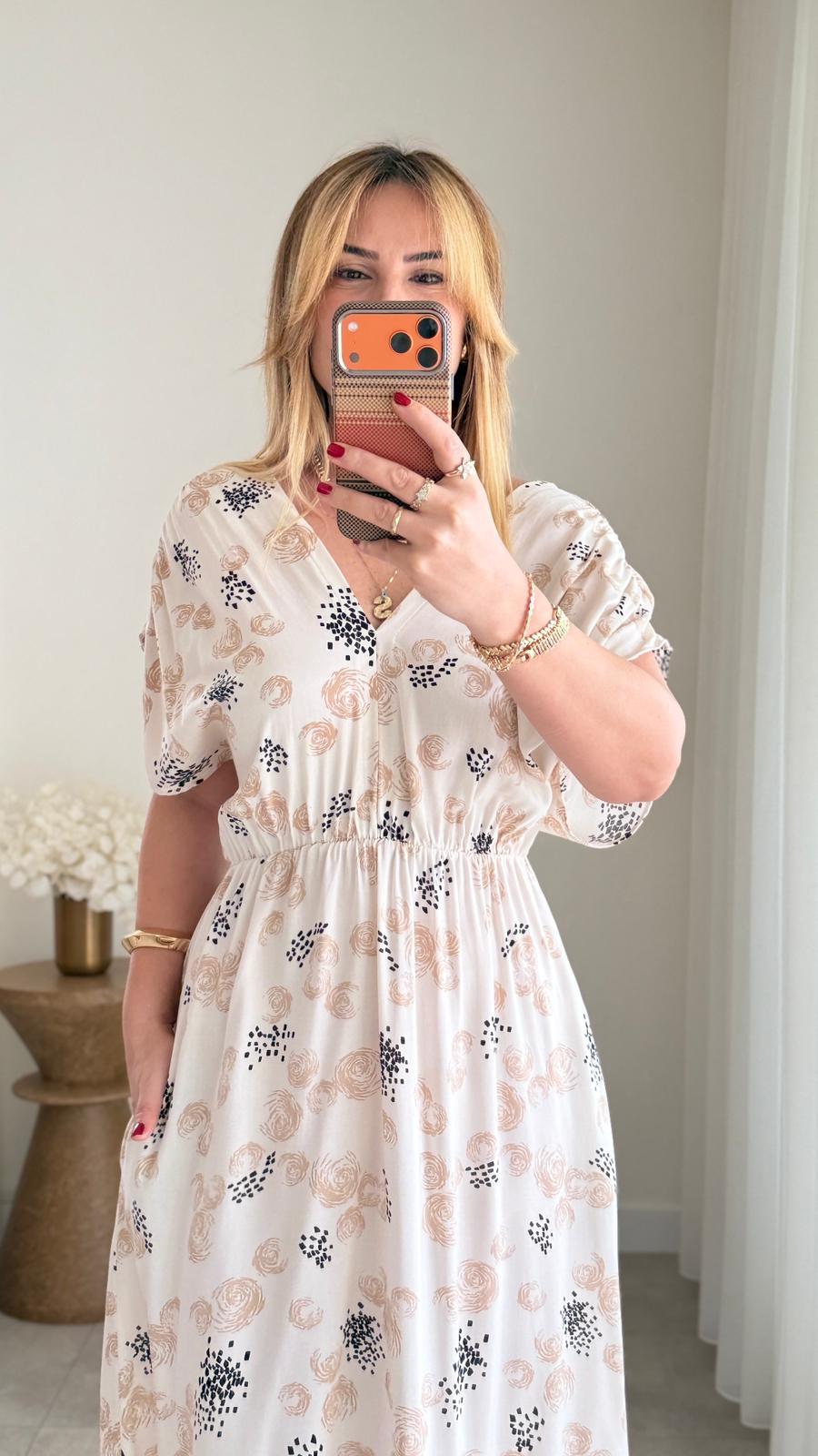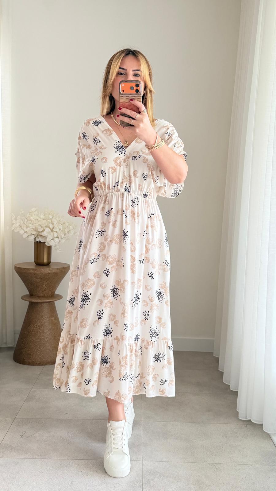8936 Ekru Gül Desen v Yaka Bel Lastikli Elbise (SK-08936)