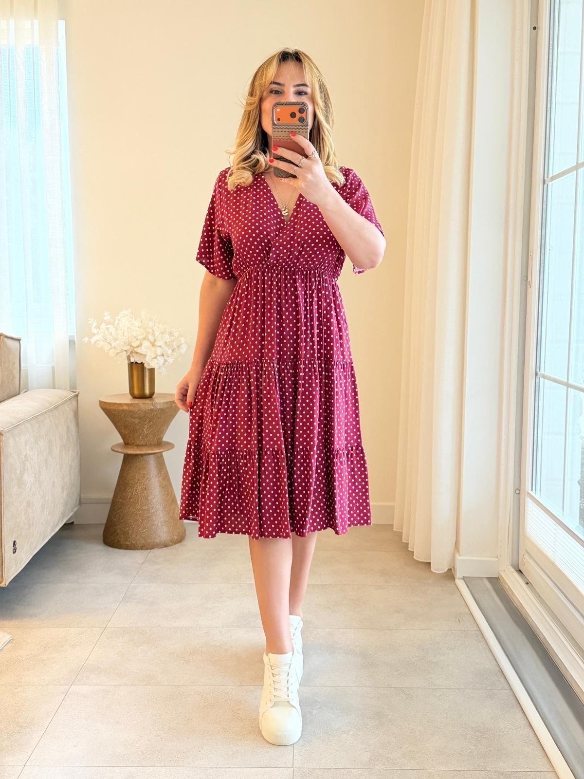 8953 Gül Kurusu Puantiye Kruvaze Yaka Elbise (SK-08953)