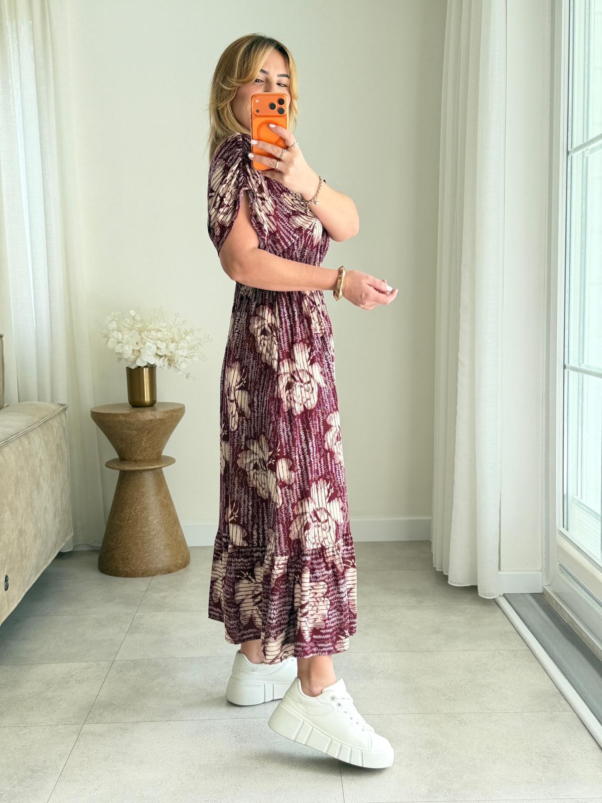 8983 Bordo Çiçek Desen v Yaka Bel Lastikli Elbise