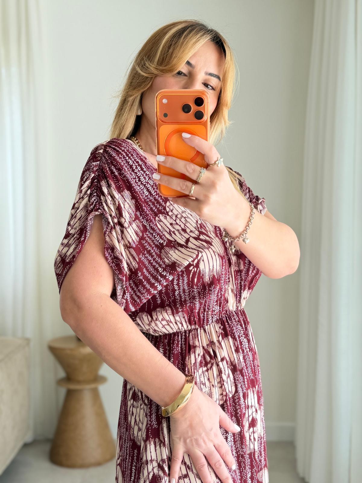 8983 Bordo Çiçek Desen v Yaka Bel Lastikli Elbise (SK-08983)