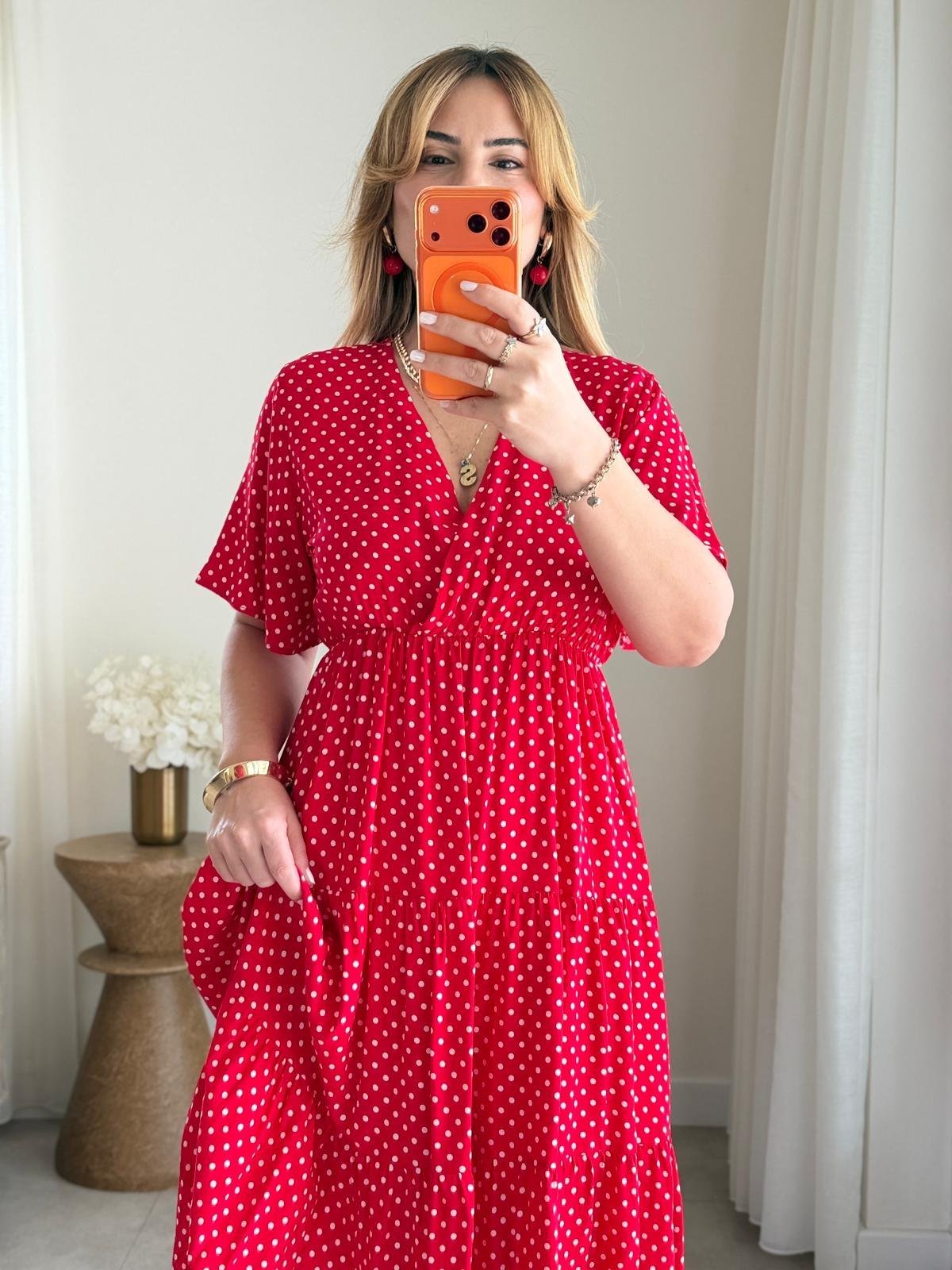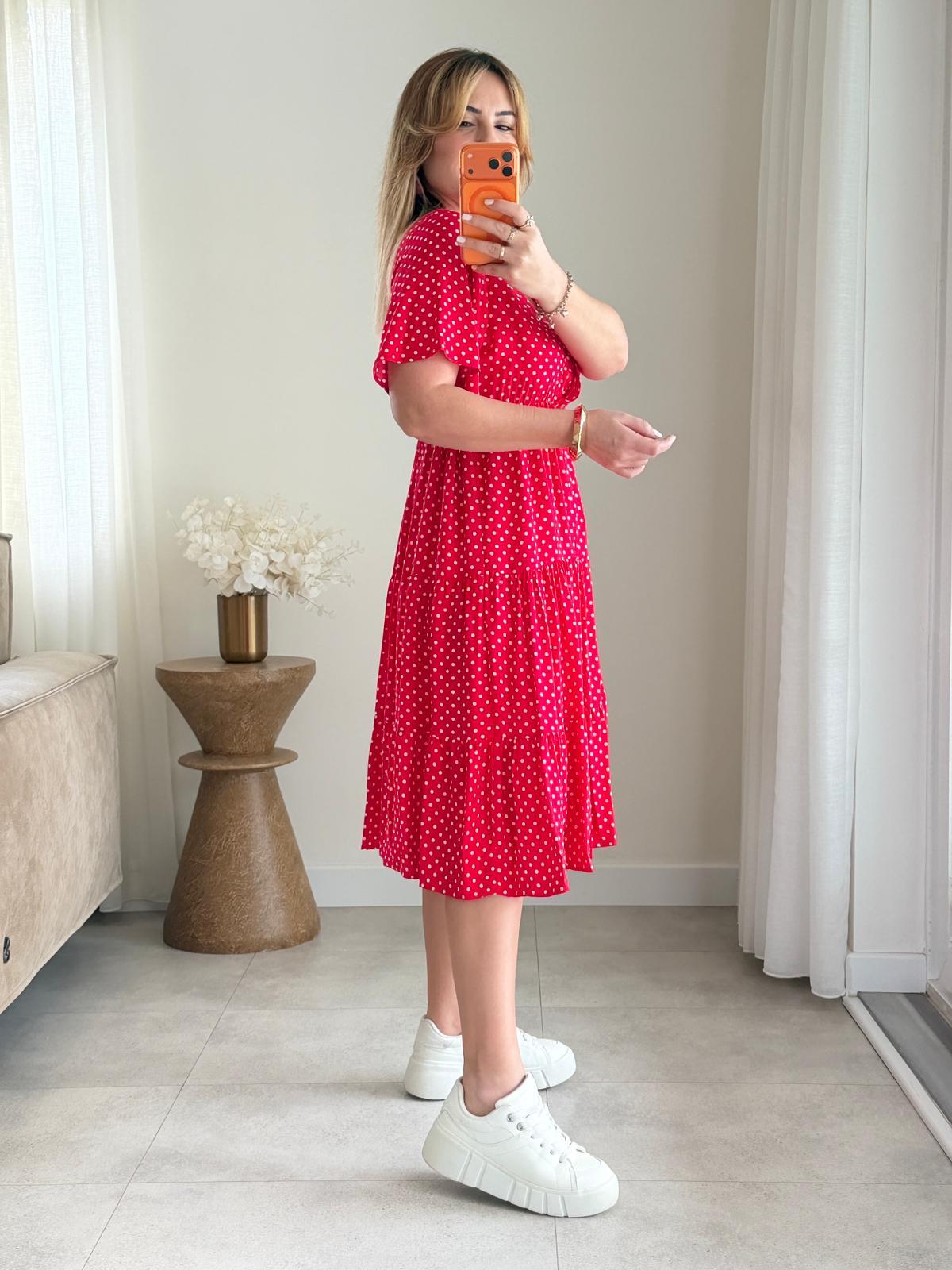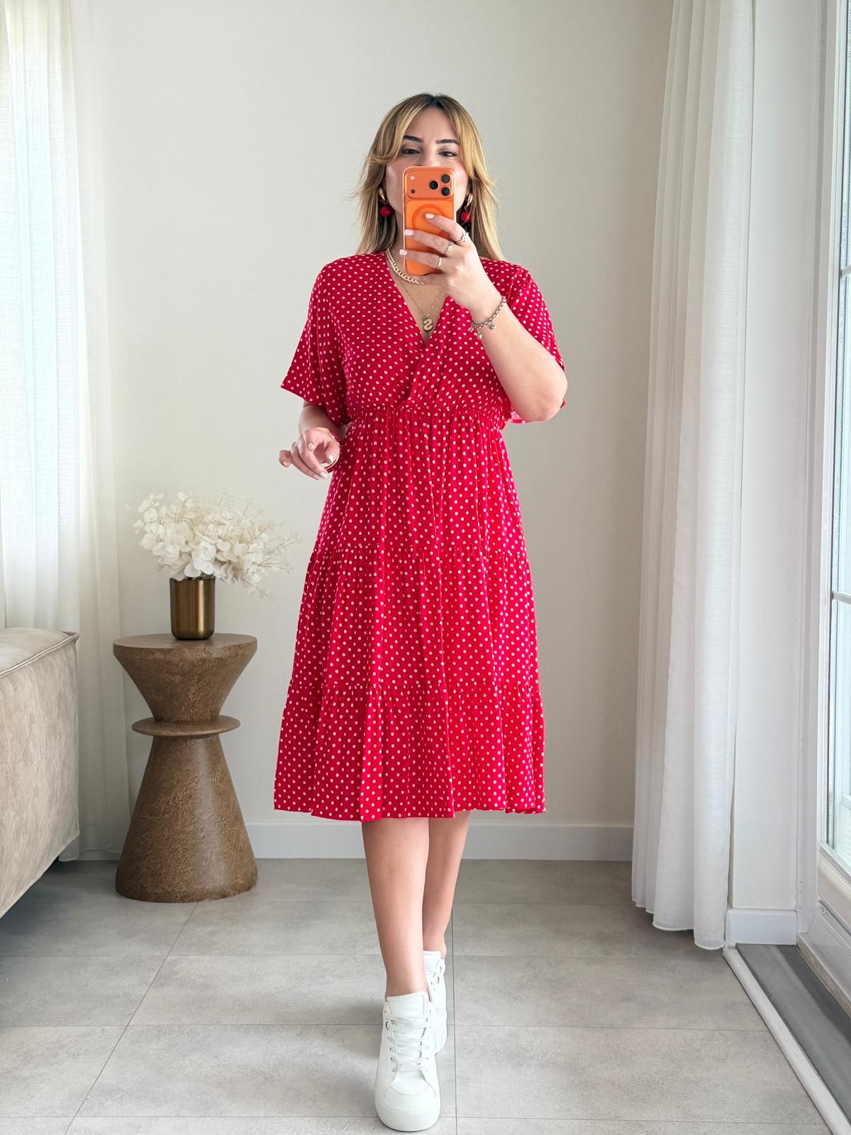 8984 Kırmızı Puantiye Kruvaze Yaka Elbise (SK-08984)