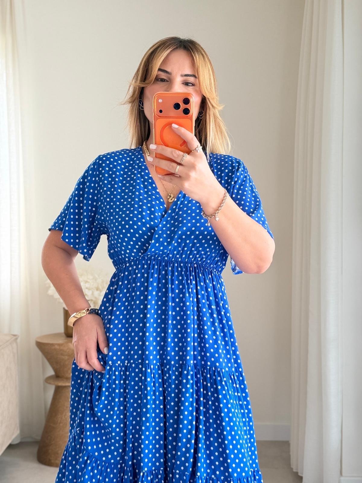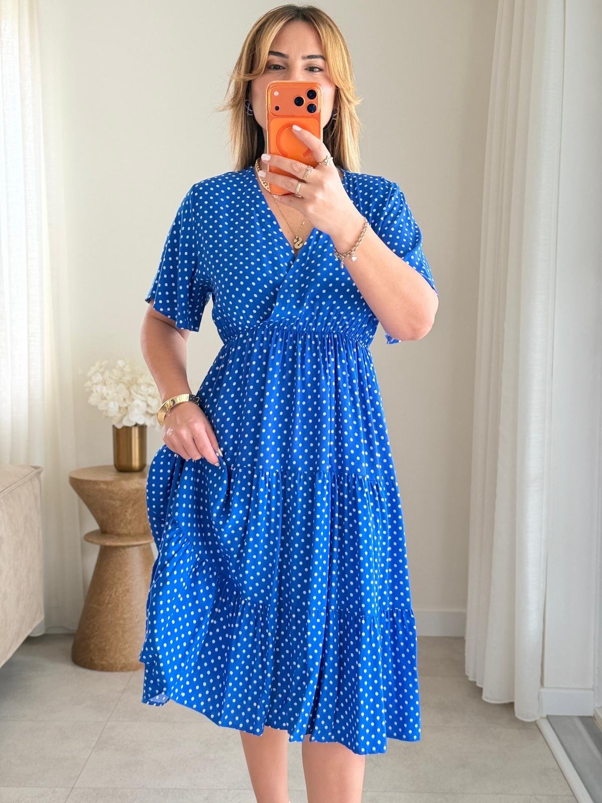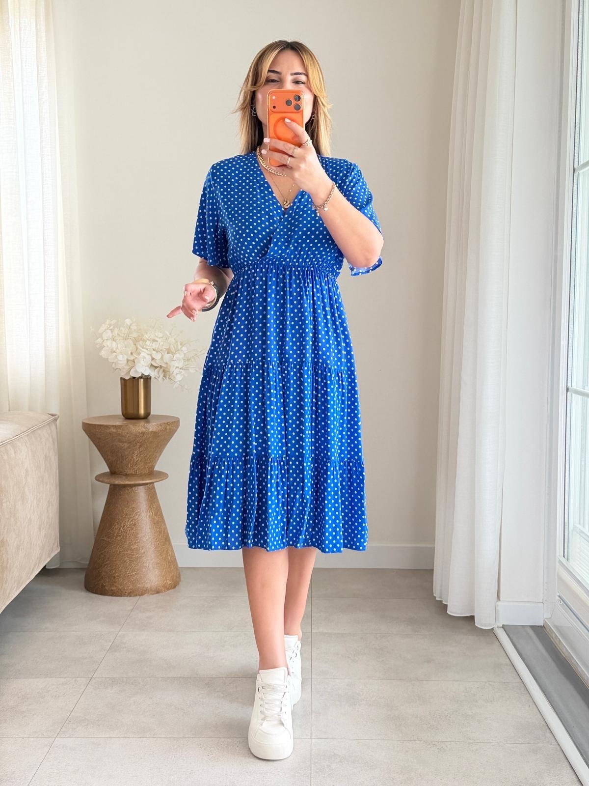 8985 Sax Puantiye Kruvaze Yaka Elbise (SK-08985)