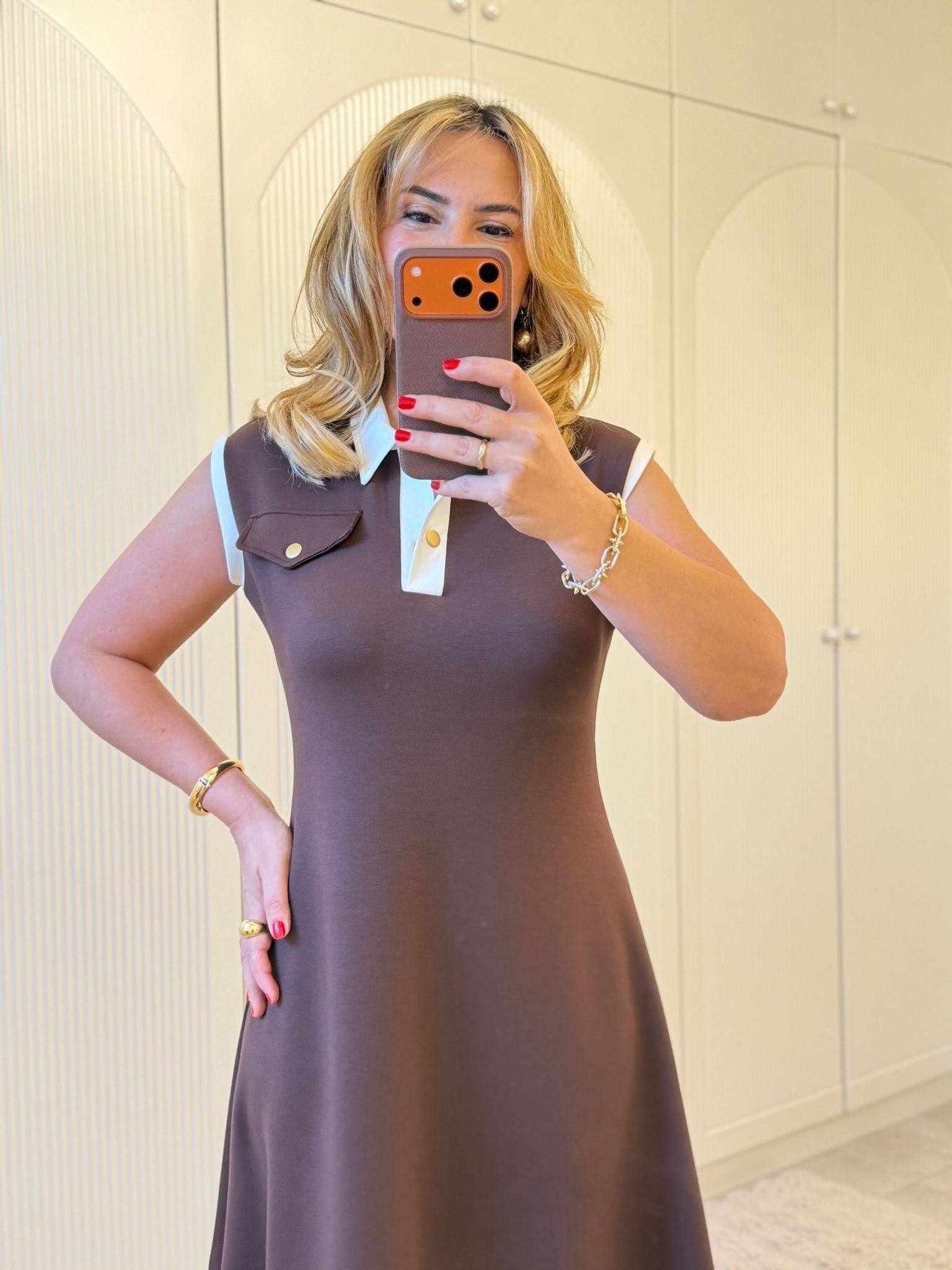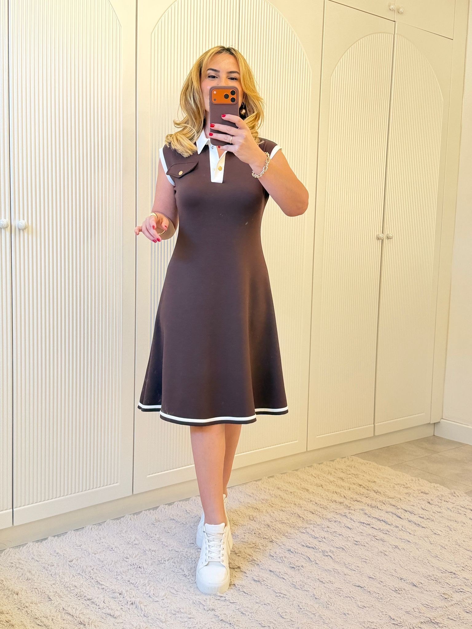 9287 Kolsuz Şerit Detay Kahve Elbise