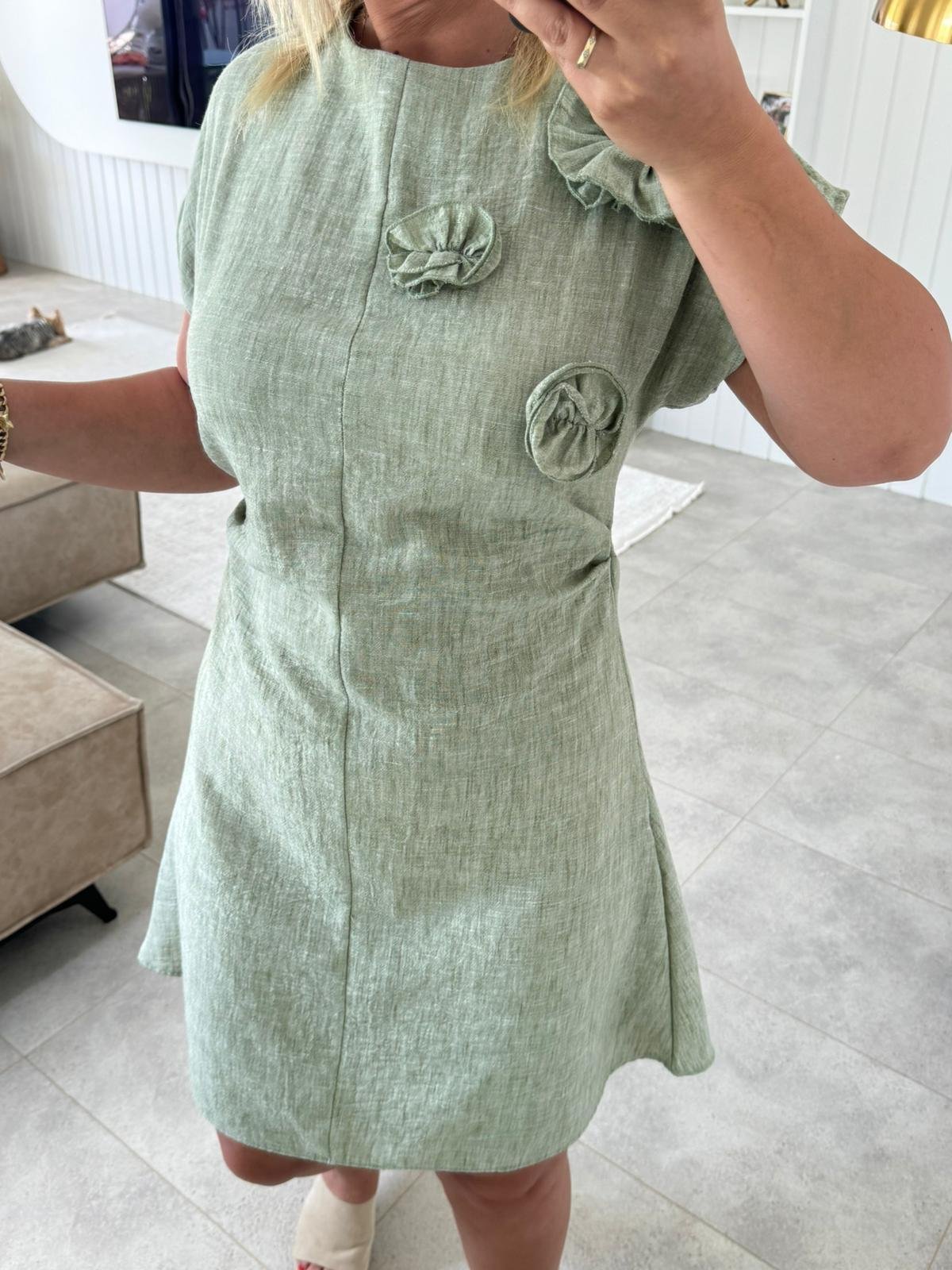 6310 Gül Detay Haki Keten Elbise (SK-06310)