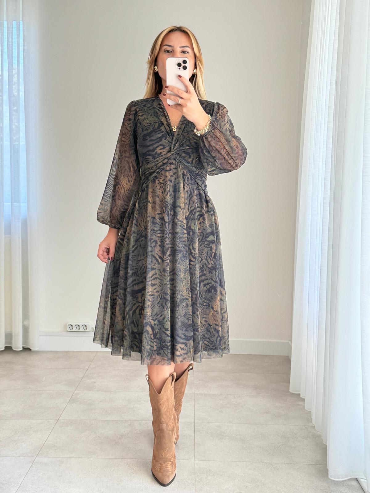 HAKİ ÖN DÜĞÜMLÜ TÜL ELBİSE