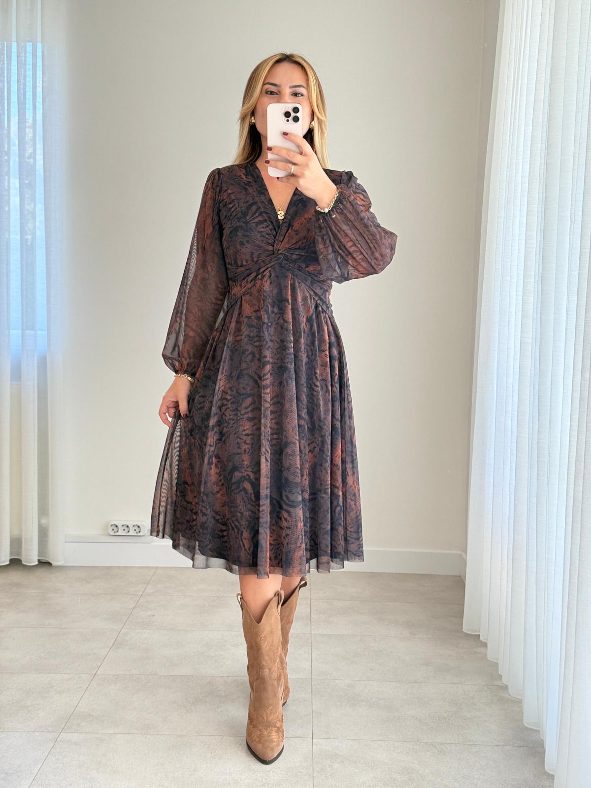 KAHVE ÖN DÜĞÜMLÜ TÜL ELBİSE