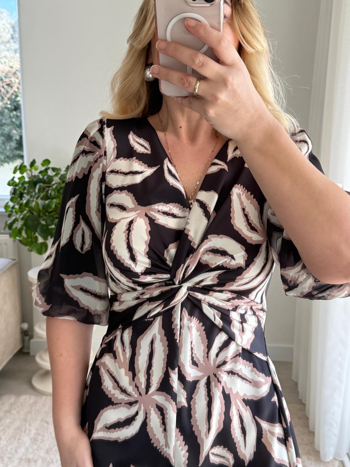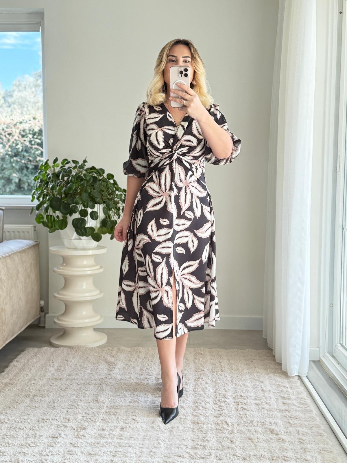 6757 Kahve Saten Yırtmaç Midi Elbise