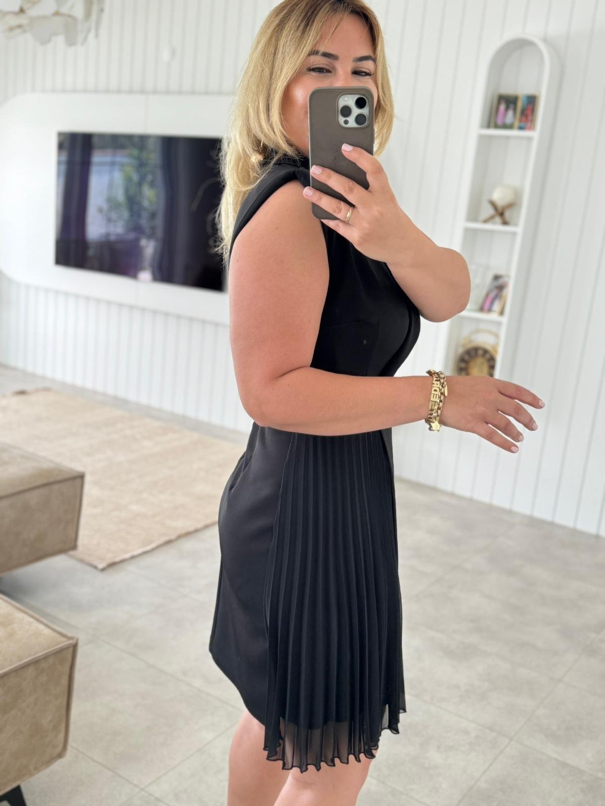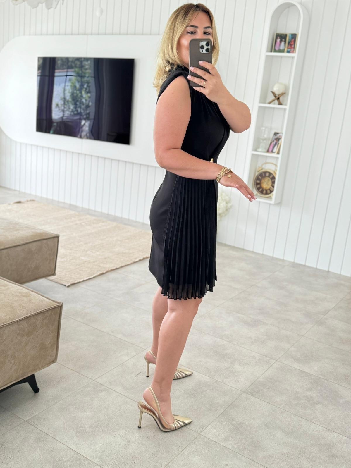 6184 Piliseli Kolsuz Siyah Ceket Elbise (SK-06184)