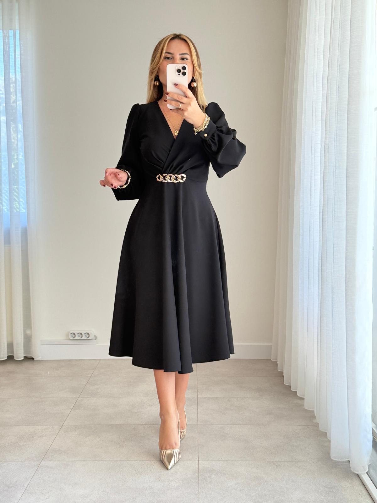 SİYAH KRUVAZE YAKA ÖRME KREP ELBİSE
