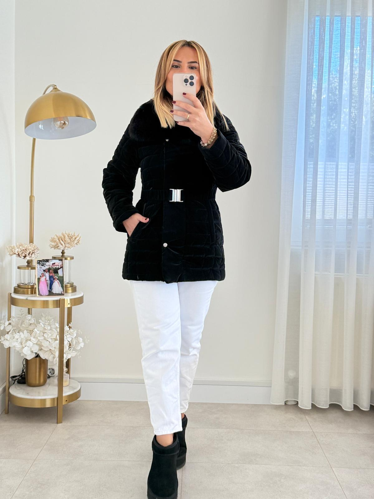 SİYAH KÜRK DETAY KEMERLİ MONT
