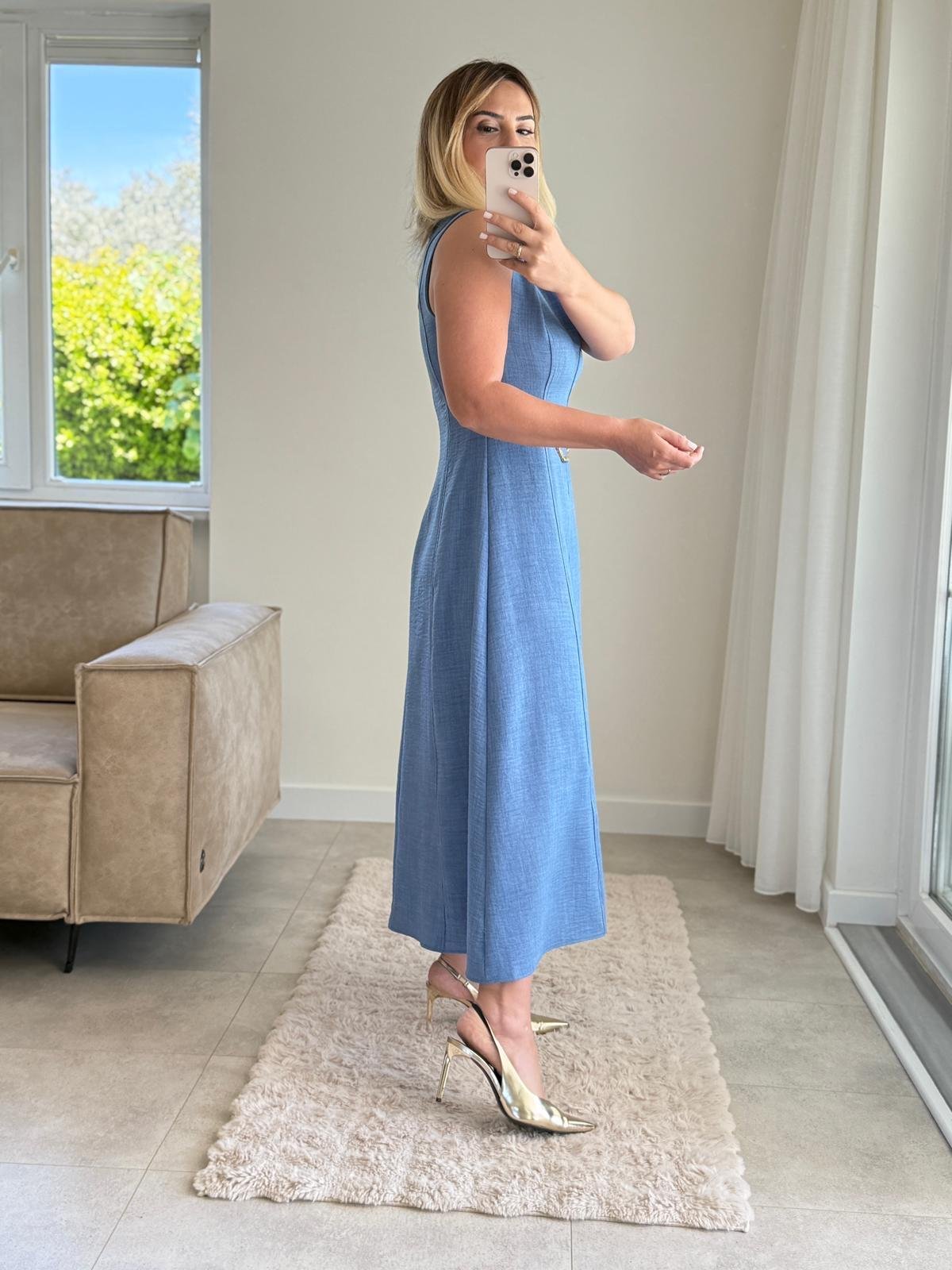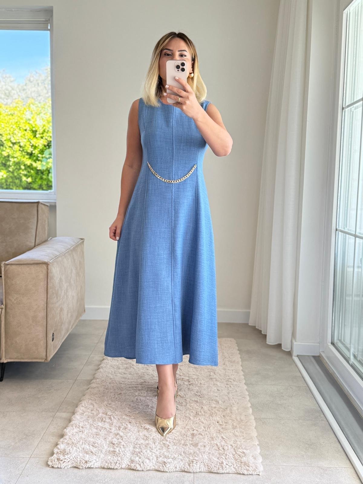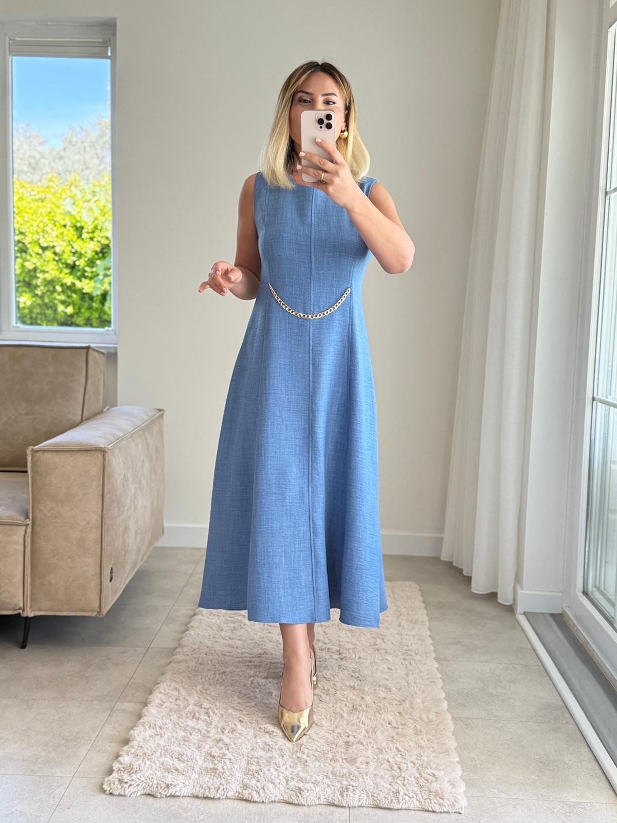 7859 Zincir Detaylı İndigo Elbise (SK-07859)
